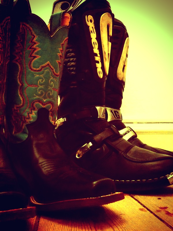 One small pair of ladies cowboy boots & One large pair of my old off-road boots.